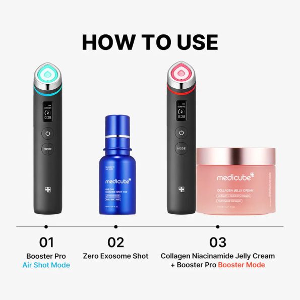Renew your skin with a complete 3-step home aesthetic routine powered by next-generation innovation. Begin with the Booster Pro Air Shot to refine skin texture and prep your complexion. Follow with the Zero Exosome Shot, which delivers 15M patented Exosome shots deep into the pores for targeted treatment and revitalization. Complete your routine with the Collagen Jelly Cream, applied together with the Booster Pro to maximize absorption, boost elasticity, and lock in hydration. Together, these three steps work in harmony to smooth uneven texture, restore firmness, and reveal radiant, healthy-looking skin��your all-in-one solution for visible skin renewal.